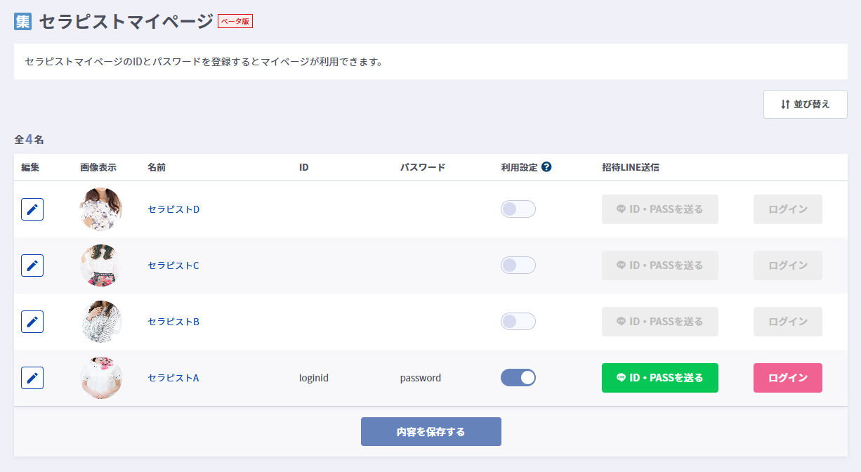 | 招待LINE送信 | セラピストマイページのID・パスワードのテキストコピーや、LINEで情報を送信することができます。 |
