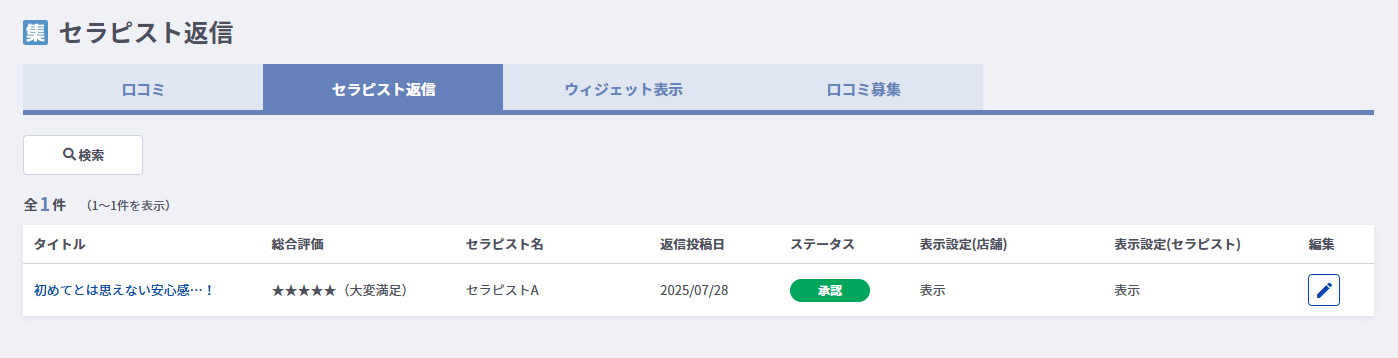 セラピストからの口コミ返信を掲載ページに表示するには、ステータスを承認に変更する必要があります。